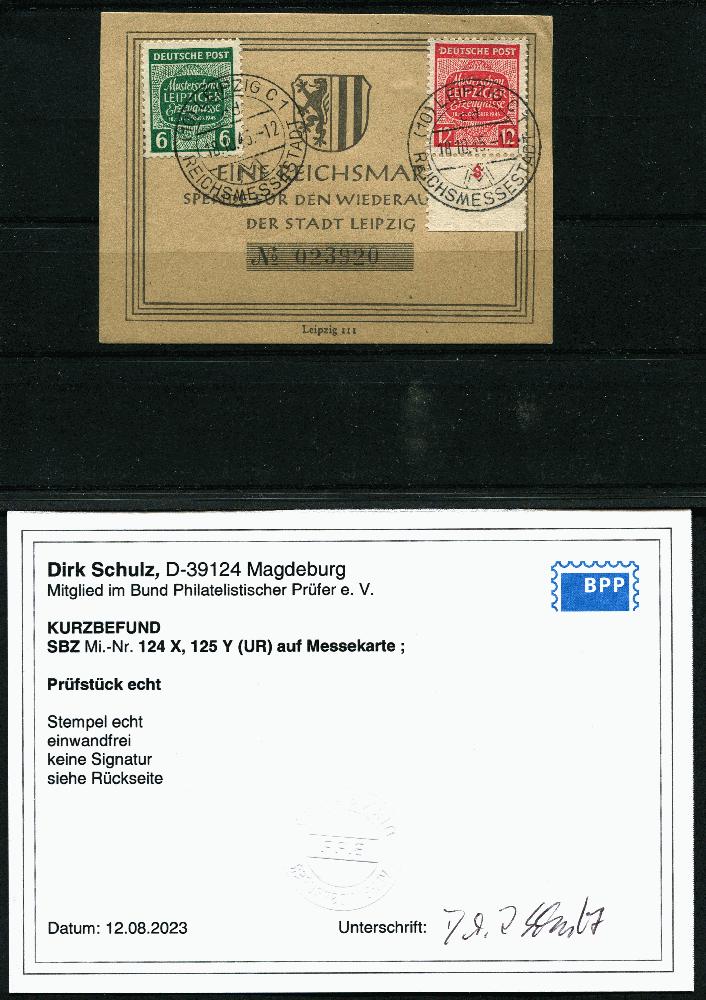 Mi.Nr. 124 X mit dem seltenen Wasserzeichen Stufen fallend zusammen mit 125 Y auf schöner originaler Eintrittskatte zur Leipziger Messe 1945
