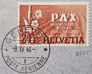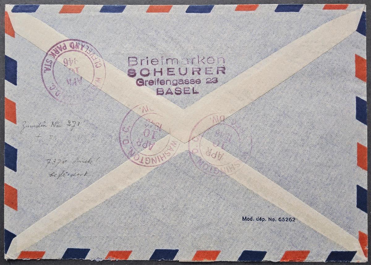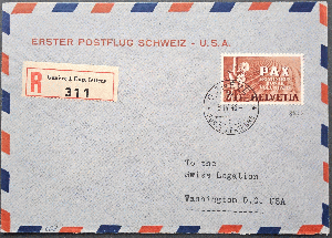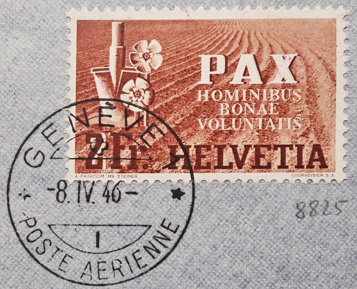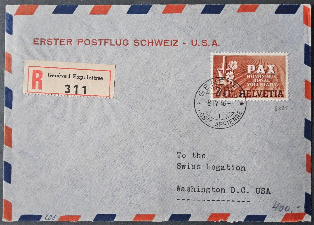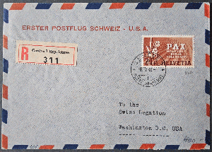 Einzelfrankatur der Mi. Nr. 456 2 Franken aus dem PAX - Satz. Erster Postflug Schweiz- USA an die schweizer Delegation. Gute Erhaltung. Bitte Photos/ Scans anschauen!