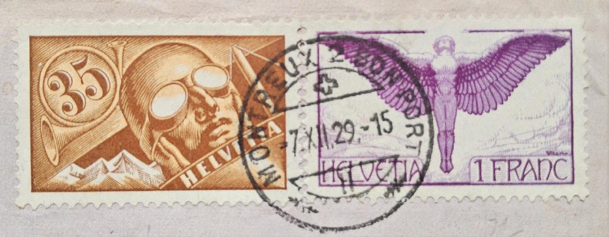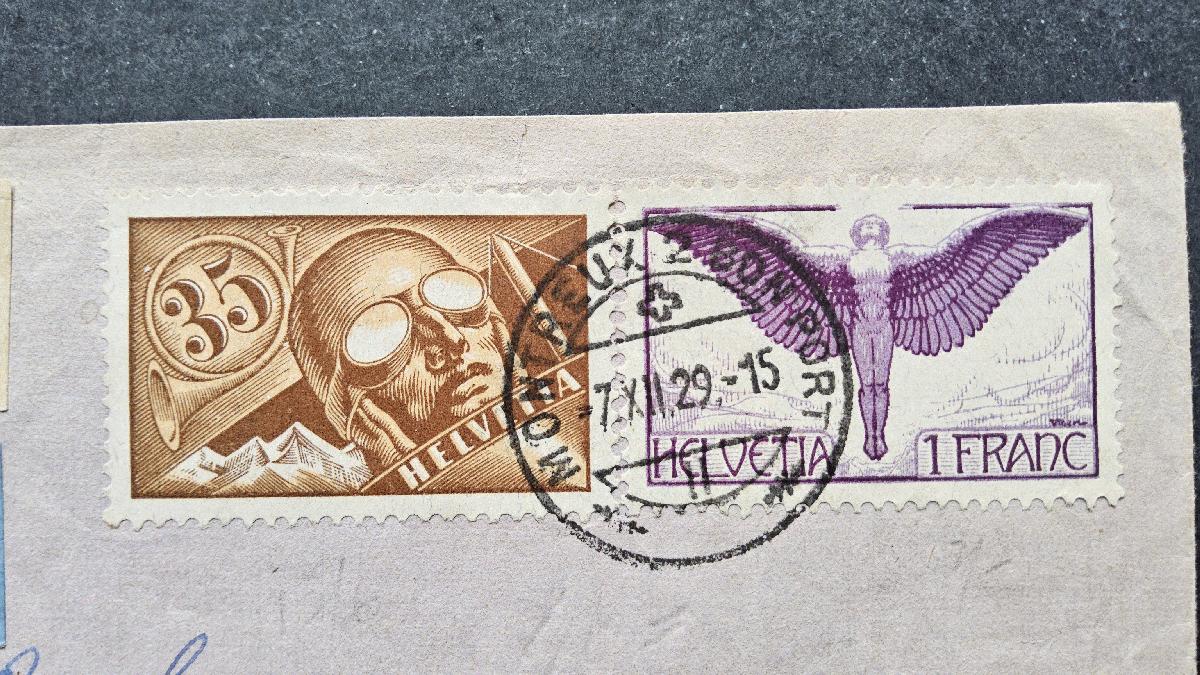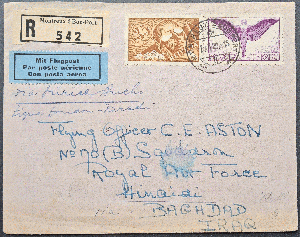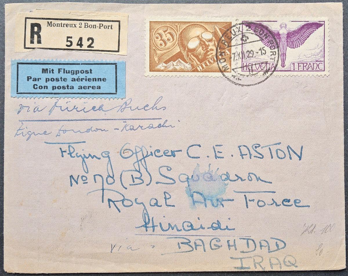 Biete diesen Brief von Montreux/ Schweiz nach Baghdad/ Irak an. Mischfrankatur Mi. Nr. 181x und 191x. Brief lief über Zürich und dann weiter auf der Linie London- Karachi. Empfänger Flying Officer der No. 70 B Squadron der Royal Air Force (RAF) in Hinaidi Baghdad/ Irak. Beleg hat Transportspuren und das Papierweist Tönungen auf.