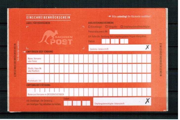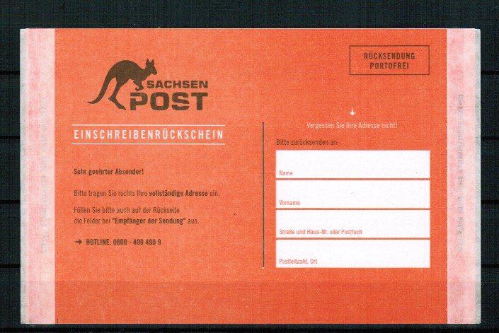 Zum Angebot kommt ein ungebrauchter Einschreibe-Rückschein Känguru Post/Sachsenpost