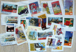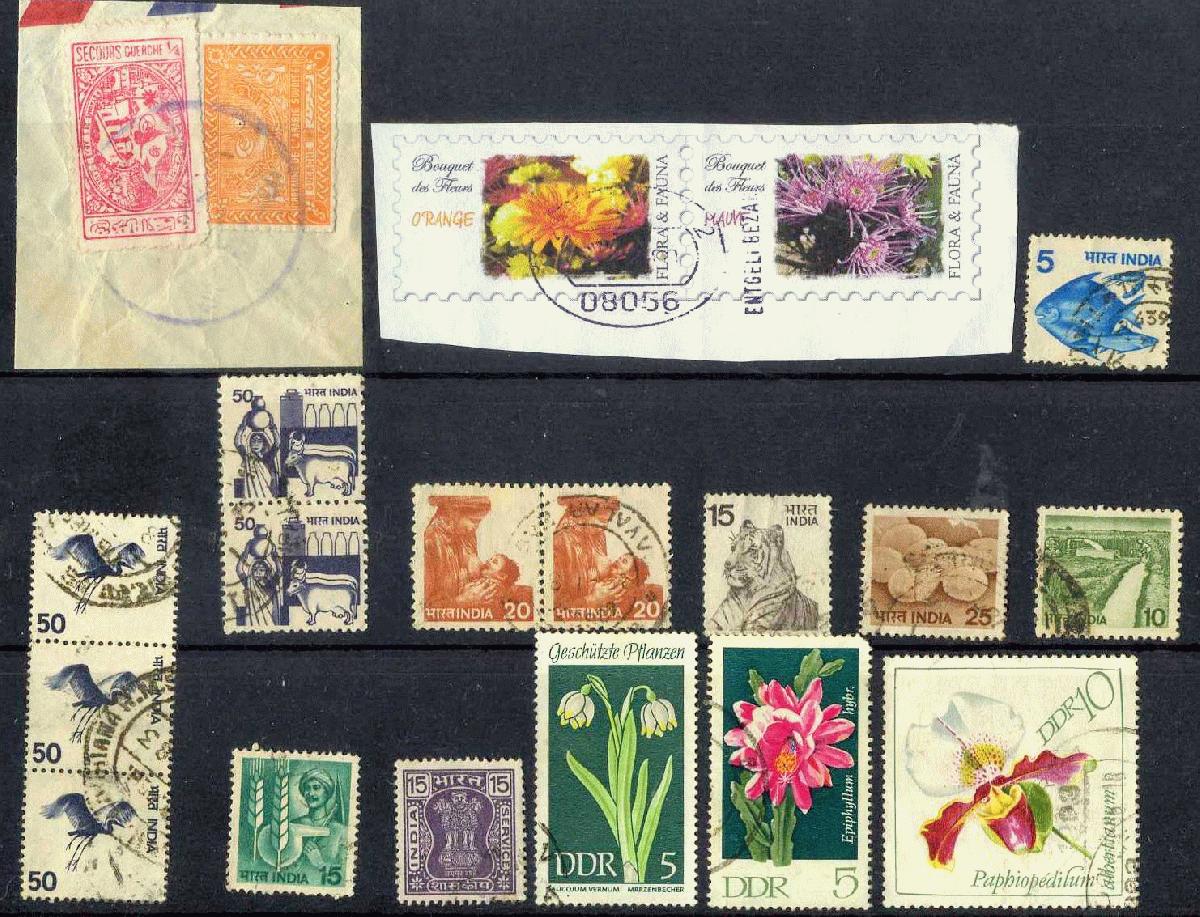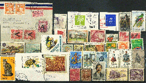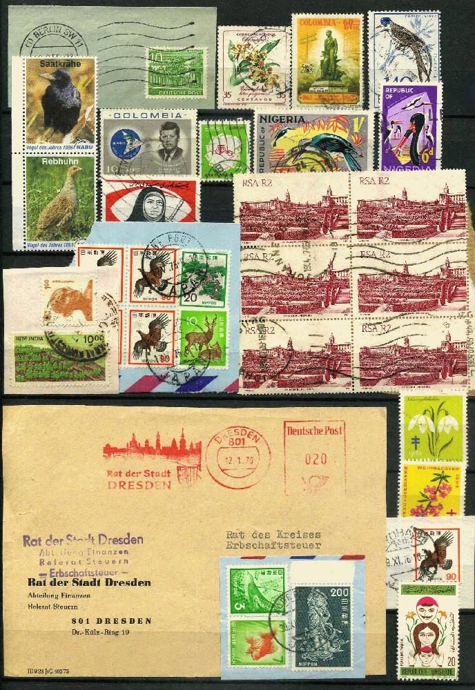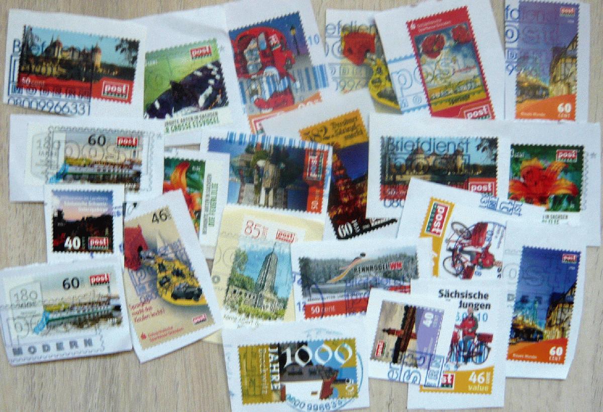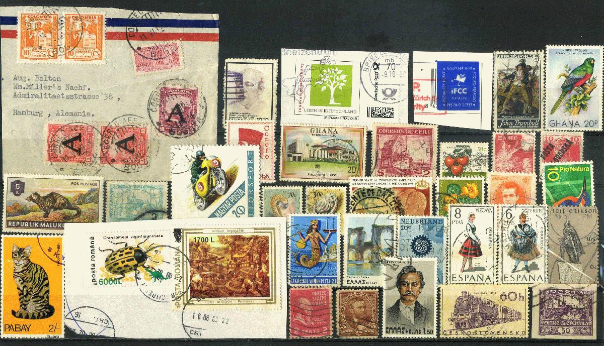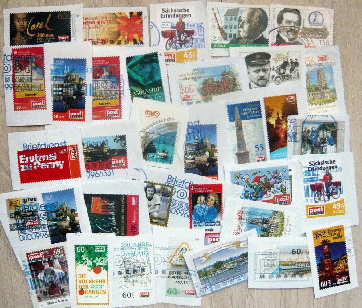 Briefmarken, Briefstücke von verschiedenen Ländern, Briefvordererseite, Privatpostmarken auf Papier. Die Marken werden ohne Steckkarte verschickt.