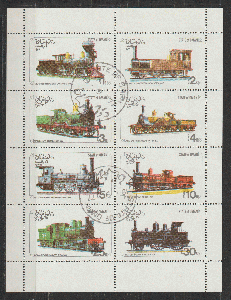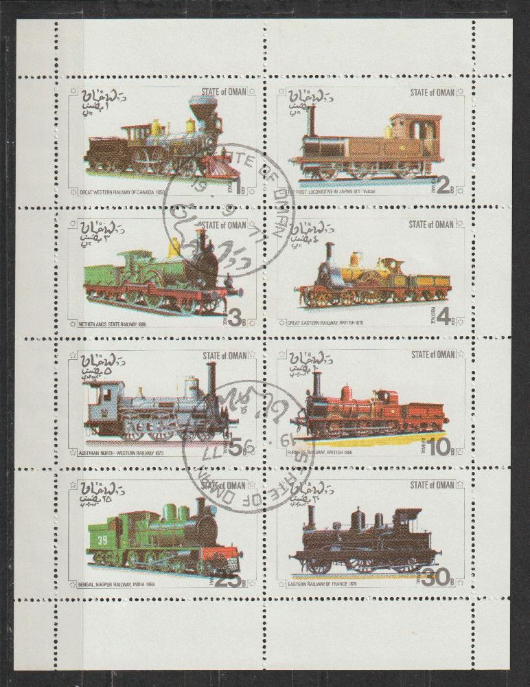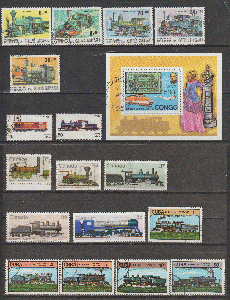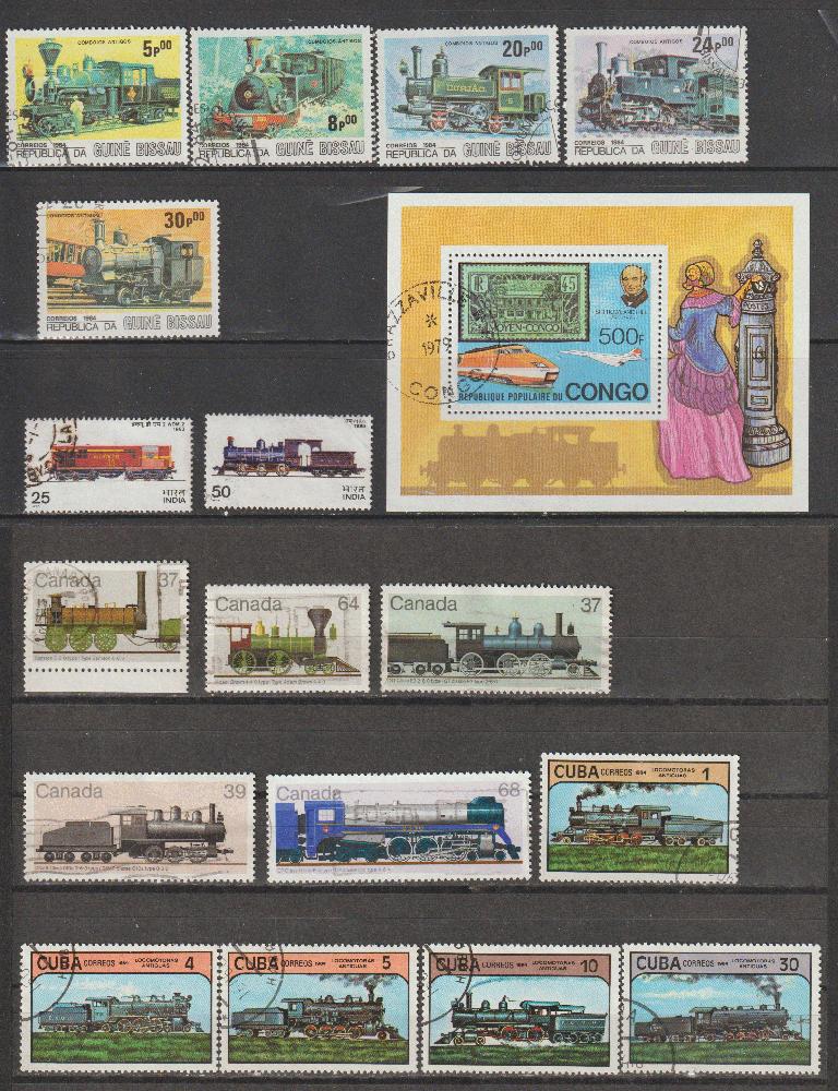 17 gestempelte Marken mit Lokomotiven aus Guinea-Bissau, Indien, Kanada und Kuba, 1 Block aus Kongo (Brassaville), 1 Block aus Oman