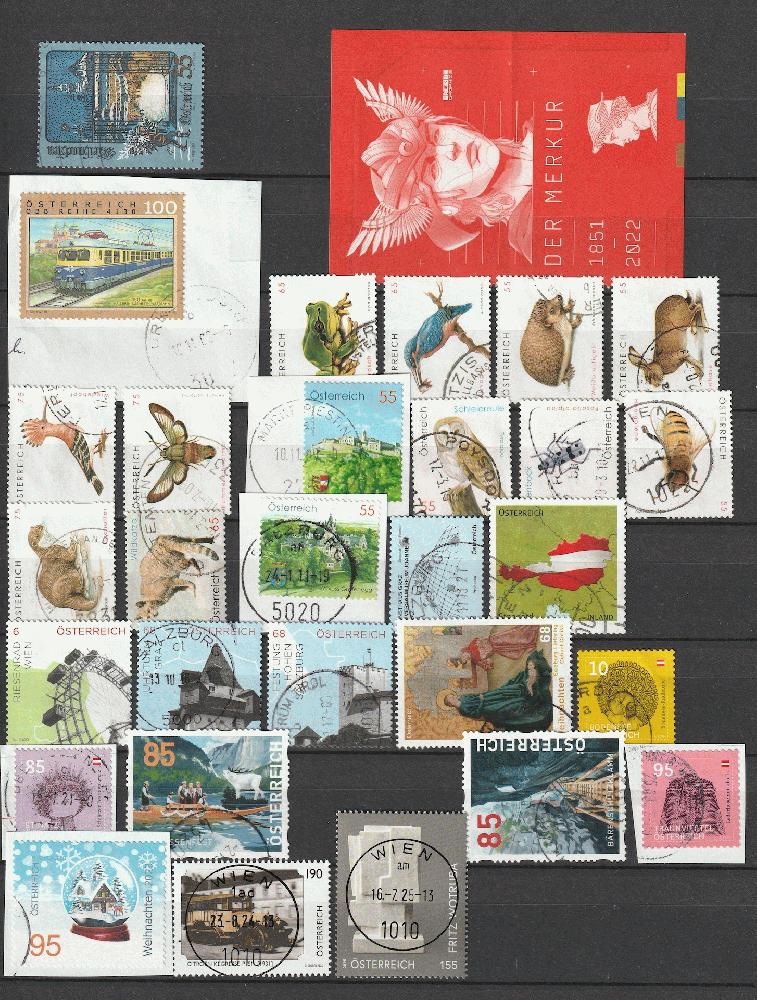 Österreich 2004-2025 Euromarken Lot gest 2004 Mi2505 2008 Mi2716-17,2729-30,2754-55,2762 2009 Mi2789,2800,2817,2819 2020 Mi2847,2849,2883 2012 Mi2978, Mi3005II 2015 Mi3184,3187,3192,3241 2020 Mi3514-15, Dispenser Mi33, Mi37 2022 Deckblatt von Mi Bl135 „der Merkur“ 2023 Mi3740,3765 2024 Mi3812 2025 Mi3908 teilweise auf Papier Paypal=möglich
