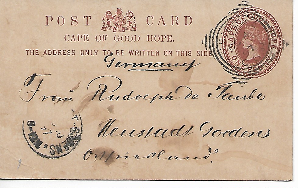 Gelaufene GZ Südafrika(Kap d.G.H.)1897, gelaufen nach Neustadt Gösens in Ostfriesland
