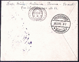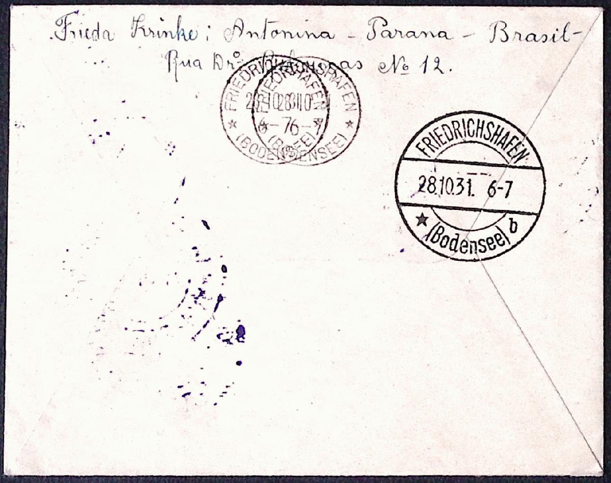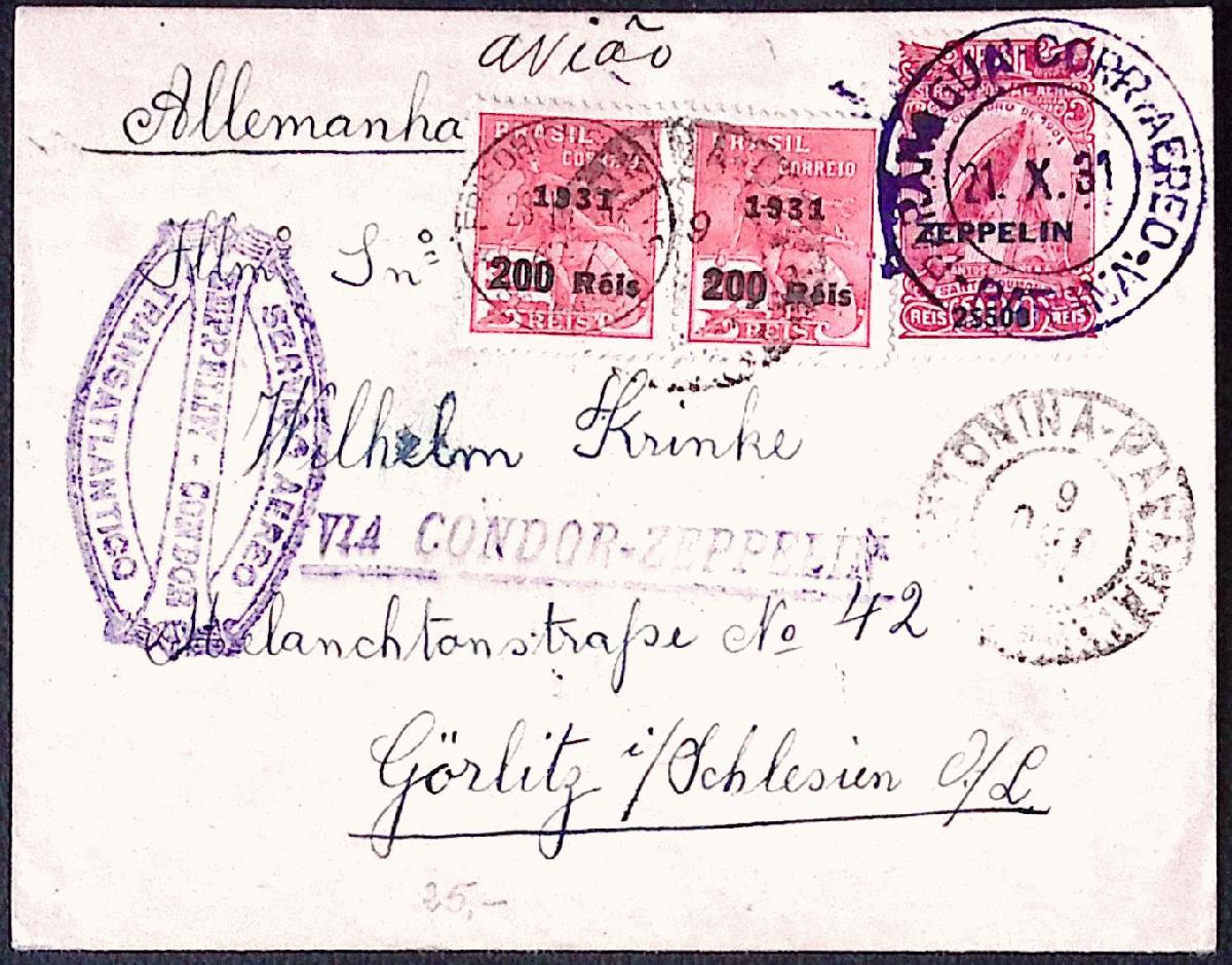 Condor-Zeppelin Brief über Friedrichshafen nach Görlitz mit FP-Marke Mi. 367 und 2xMi 365. Rückseitig Ankunftsstempel Friedrichshafen