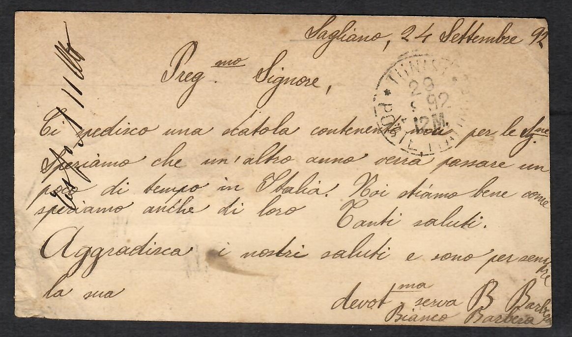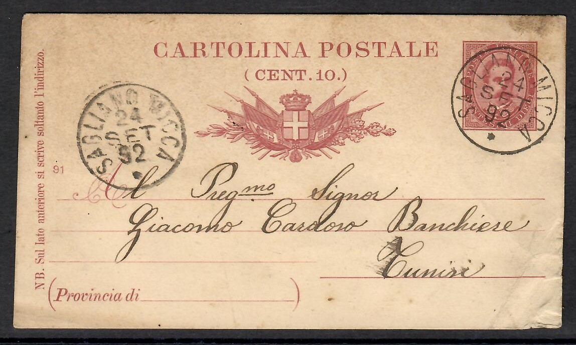 Los: Nr. 533.0526 IT-Postkarte Jg1892 Sagliano nach Tunis