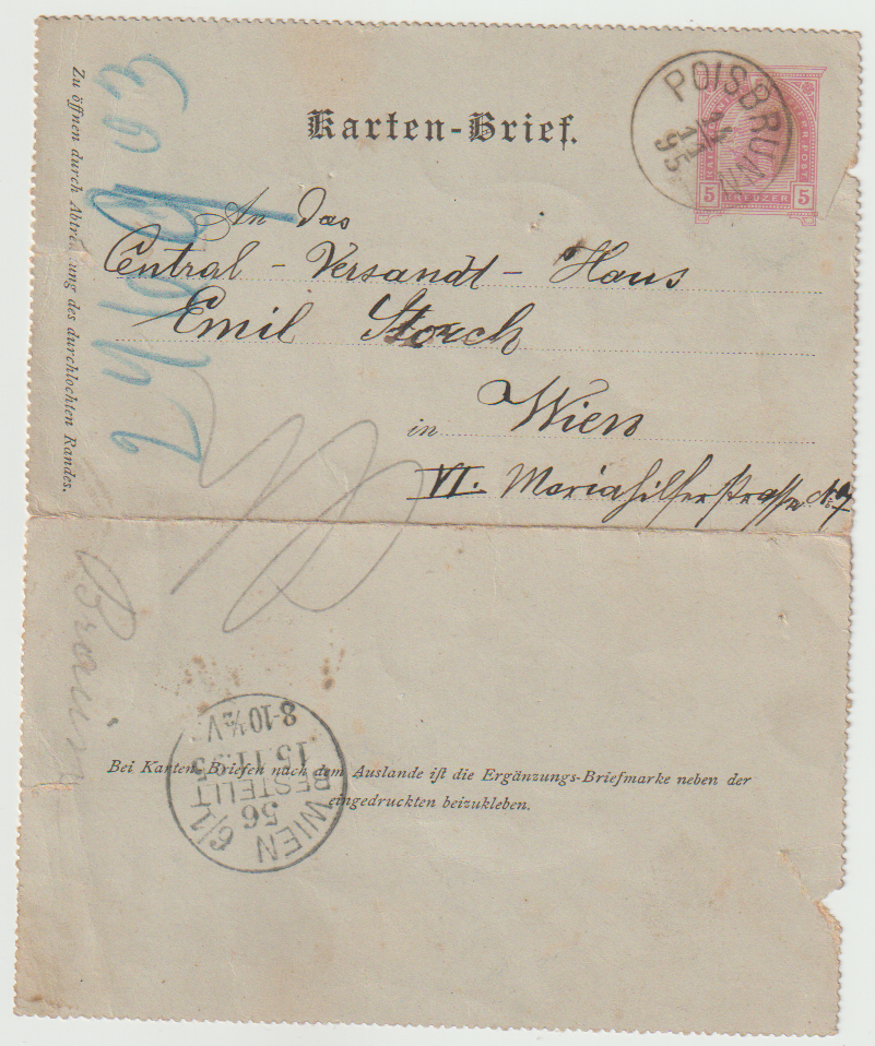 Österreich Kartenbrief von Poisbrunn nach Wien, 1895