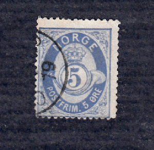 Norwegen F 24b matt ultramarin, Platte III liegendes WZ Posthorn, BYP Stempel (Stadtpost Christiania) 1879