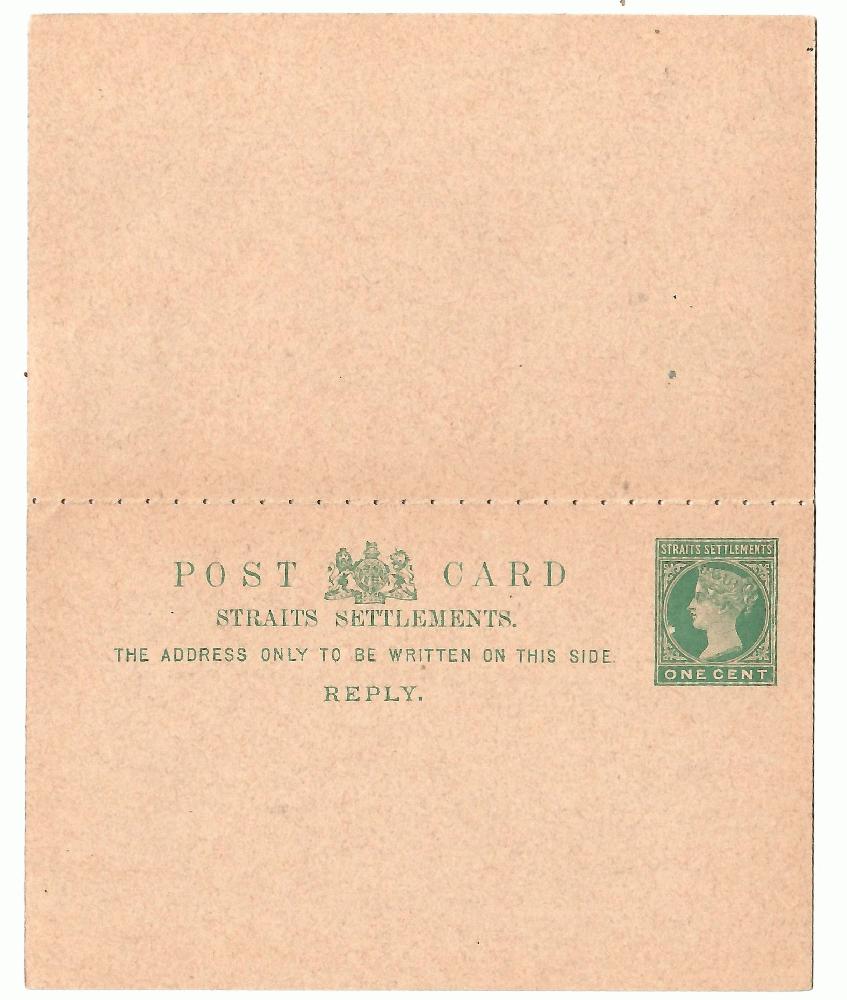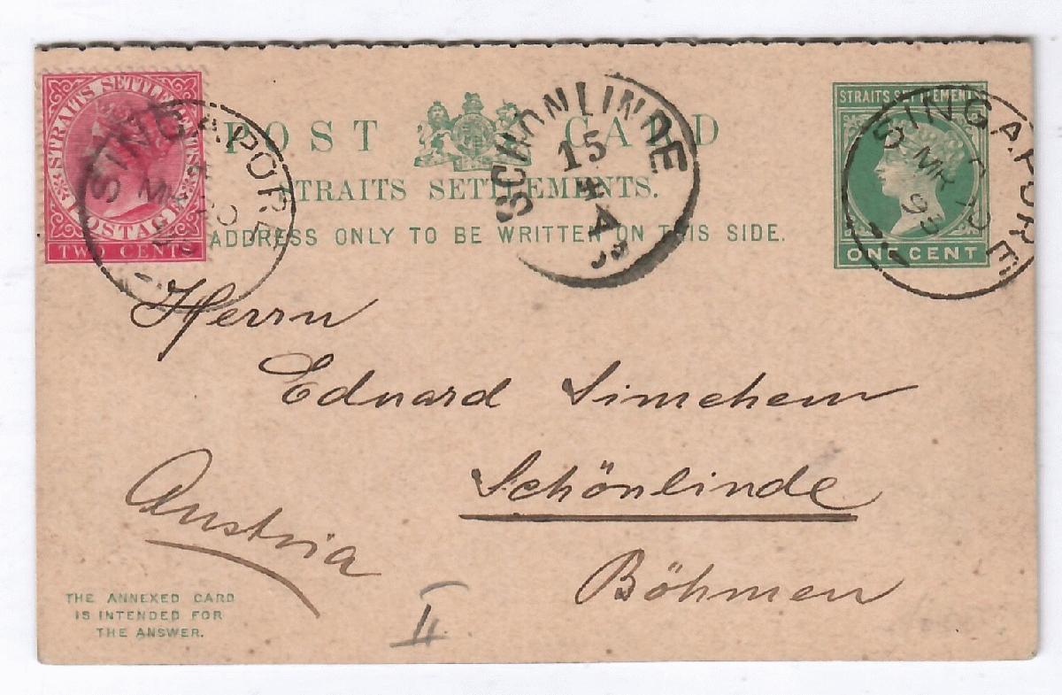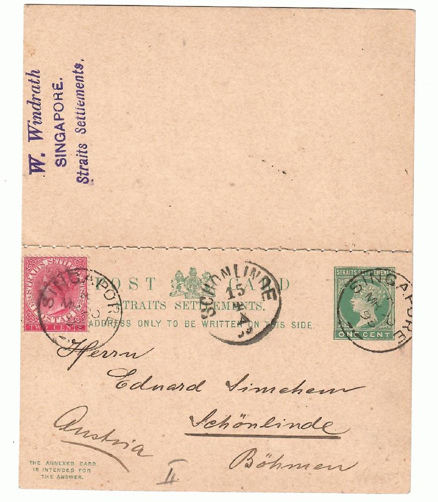 Eine Ganzsache mit unbenutzt gelassener Antwortkarte lief im März1893 von Singapur nach Schönlinde in Böhmen. Ankunftsstempel vom 15.4.93. Das Porto betrug insgesamt 3 Cents, so dass eine Zusatzfrankatur (Michel Nr. 35 B, 2 Cents rosa) notwendig war.