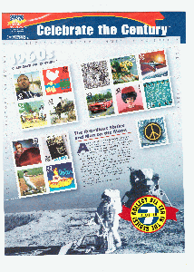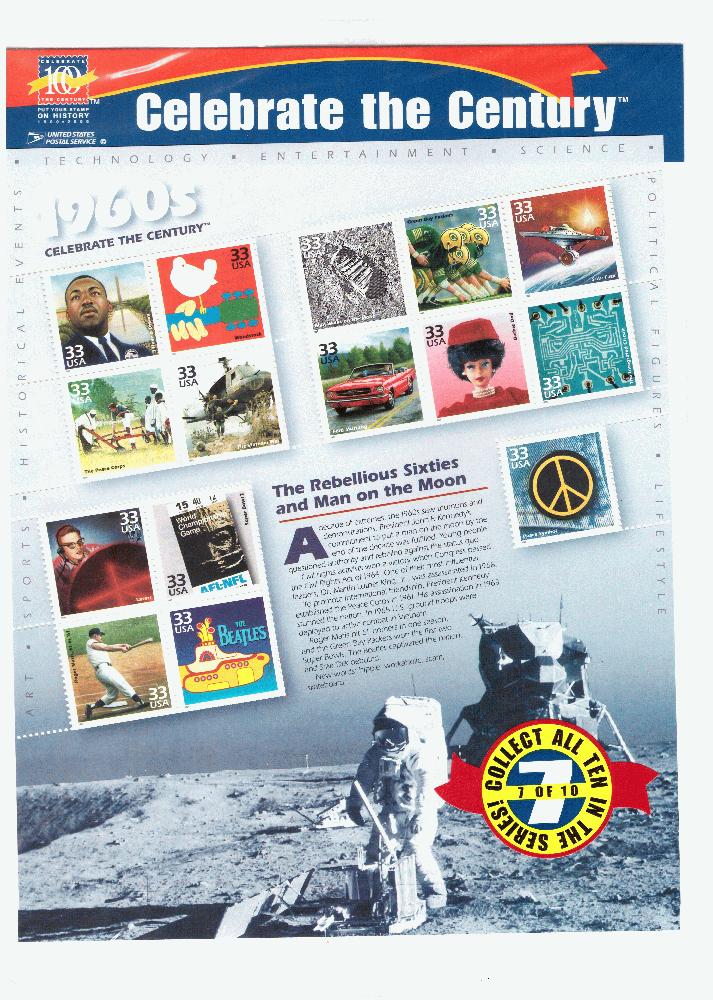 Folienblatt USA „Das Jahrhundert feiern“ 1960 Die rebellischen sechziger und der Mensch auf dem Mond noch in Original Verkaufsverpackung = Preis $ 4,95
