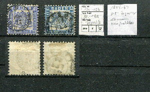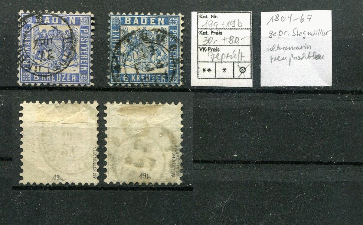 Altdeutschland Baden 1864-67 Nr. 19a ultramarin mit Zweikreisstempel Heidelberg, geprüft Stegmüller BPP und Nr. 19b preußischblau mit Zweikreisstempel Freiburg, doppelt geprüft Stegmüller BPP. Katalogwerte € 30 + € 80.